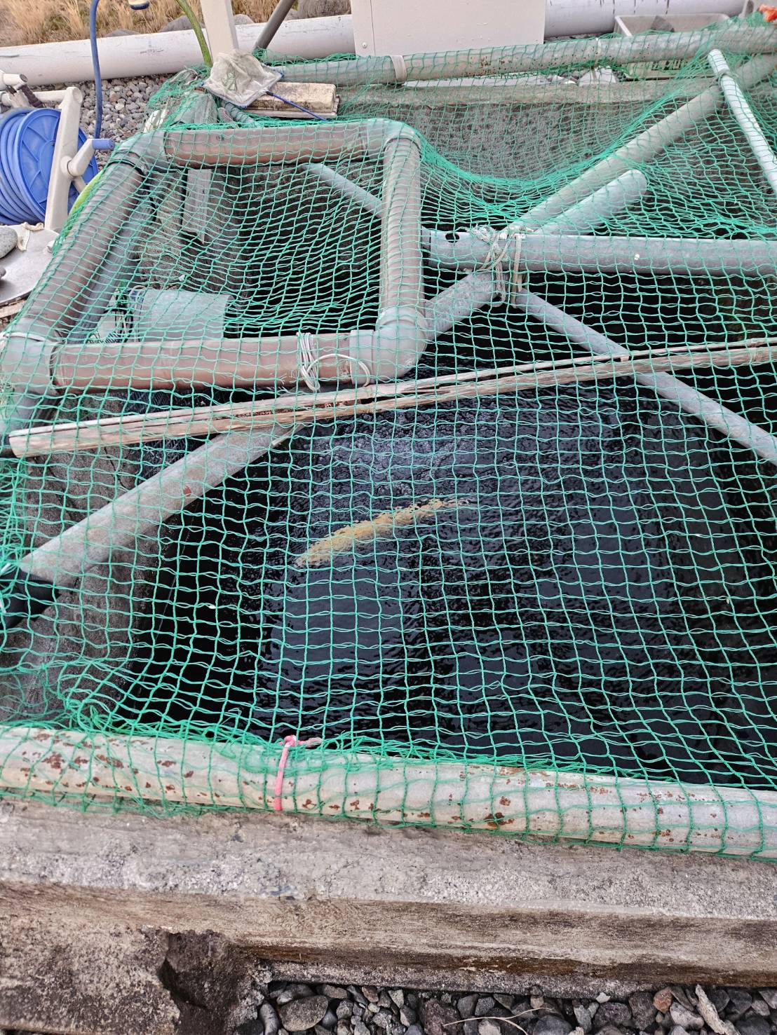 また、物置のすぐ隣にはいけすがあり、鱒が元気に泳いでいる様子も見られます。